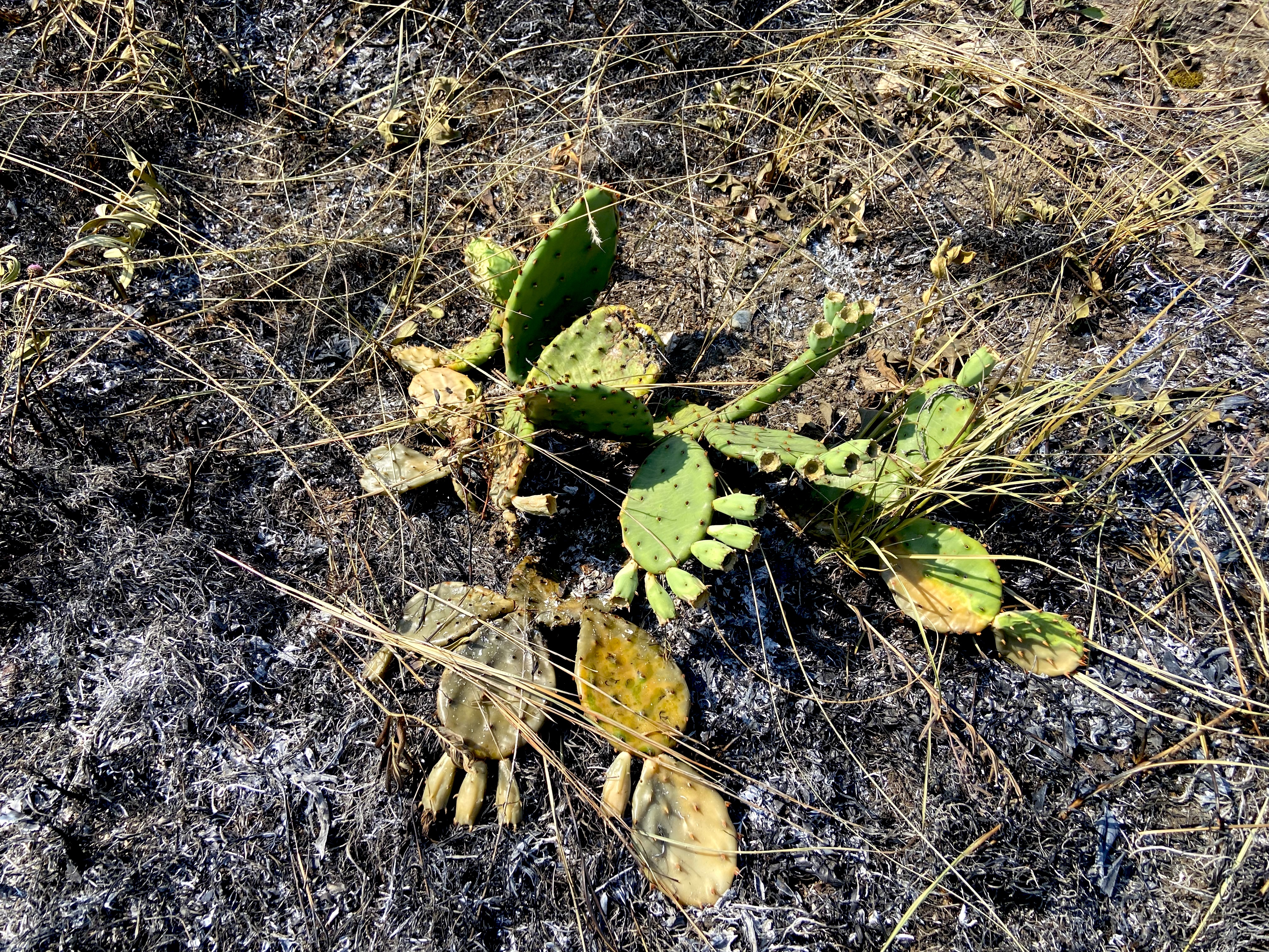 Part of this prickly pear cactus looks burned and part looks fine, including about fourteen "pears" that will be popular with some animals later on. (We humans are not allowed to taste this fruit in this legally protected Nature Preserve.)